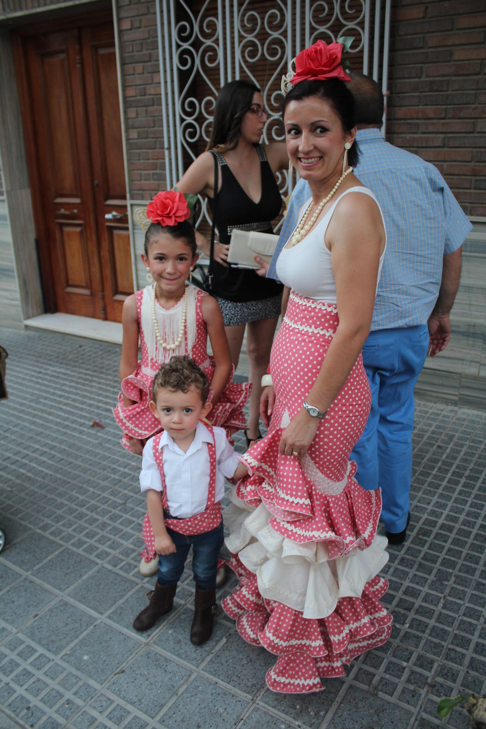 Madre e hijos participando vestidos de gitanos en la procesión de San Pedro.