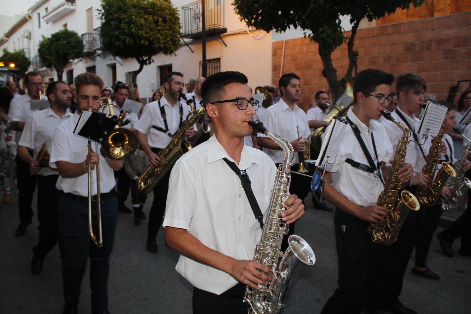 Miembros de la Asociación Musical Banda de Música ‘Villa de Nueva Carteya’ interpretando marchas durante la procesión. Foto: Brian Bujalance (InfoDiario).