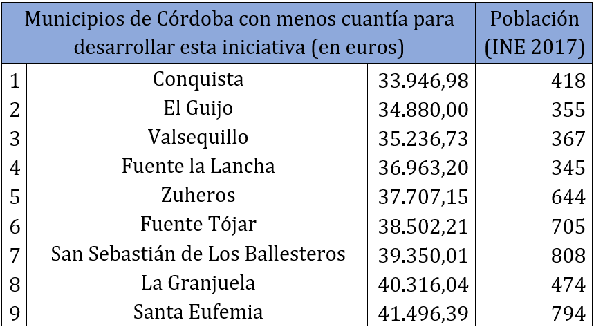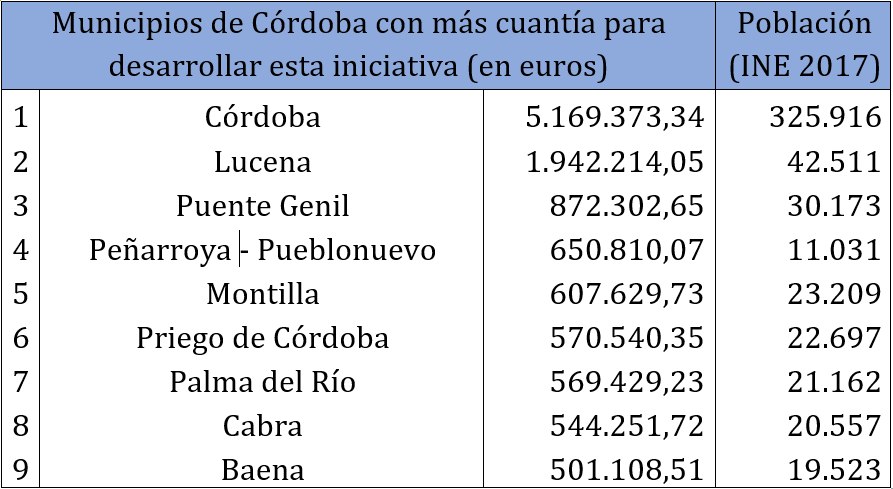 A nivel provincial, la ciudad que más dinero recibirá tras la capital es Lucena, con casi dos millones de euros. Le siguen Puente Genil (872 000 euros) y Peñarroya-Pueblonuevo, con algo más de 11 000 habitantes y que tendrá 650.000 euros para la financiación. Por el contrario, Conquista, El Guijo y Valsequillo serán los pueblos de menor subvención.