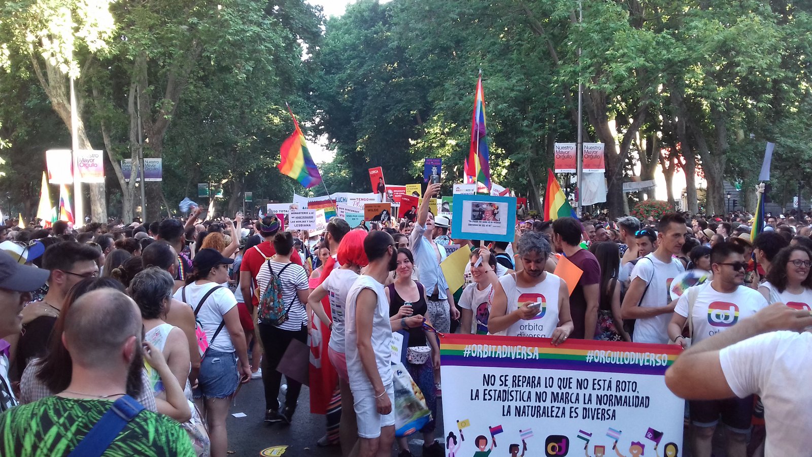 La manifestación estatal del Orgullo 2019 recorrió este sábado desde el Paseo del Prado de Madrid hasta Colón, encabezada por personas activistas históricas LGTBI. Miles de personas acudieron entre gritos de «ni un paso atrás», cánticos como «a quién le importa» de Alaska y reivindicaciones a favor de la igualdad. Estas son las imágenes de la manifestación del Orgullo LGTBI 2019.
